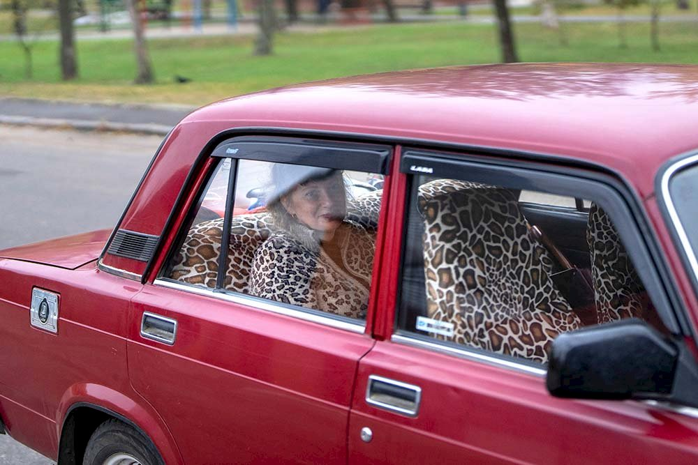 Ze zit in de trots van haarzelf en haar man, een puik onderhouden oude Lada Riva. Een Russische auto, in productie van 1980 tot 2010. In Oekraïne stonden vier fabrieken waar ze werden geassembleerd. De vrouw en haar man zijn bezeten van panterpatronen. Toen ze instapte dacht ze geen moment: onze stoelen zien er al uit als panters, wordt mijn panterjas niet te veel van het goede? Niets daarvan, ook hij draagt een panterjas. Onzichtbaar rijden ze door de stad.