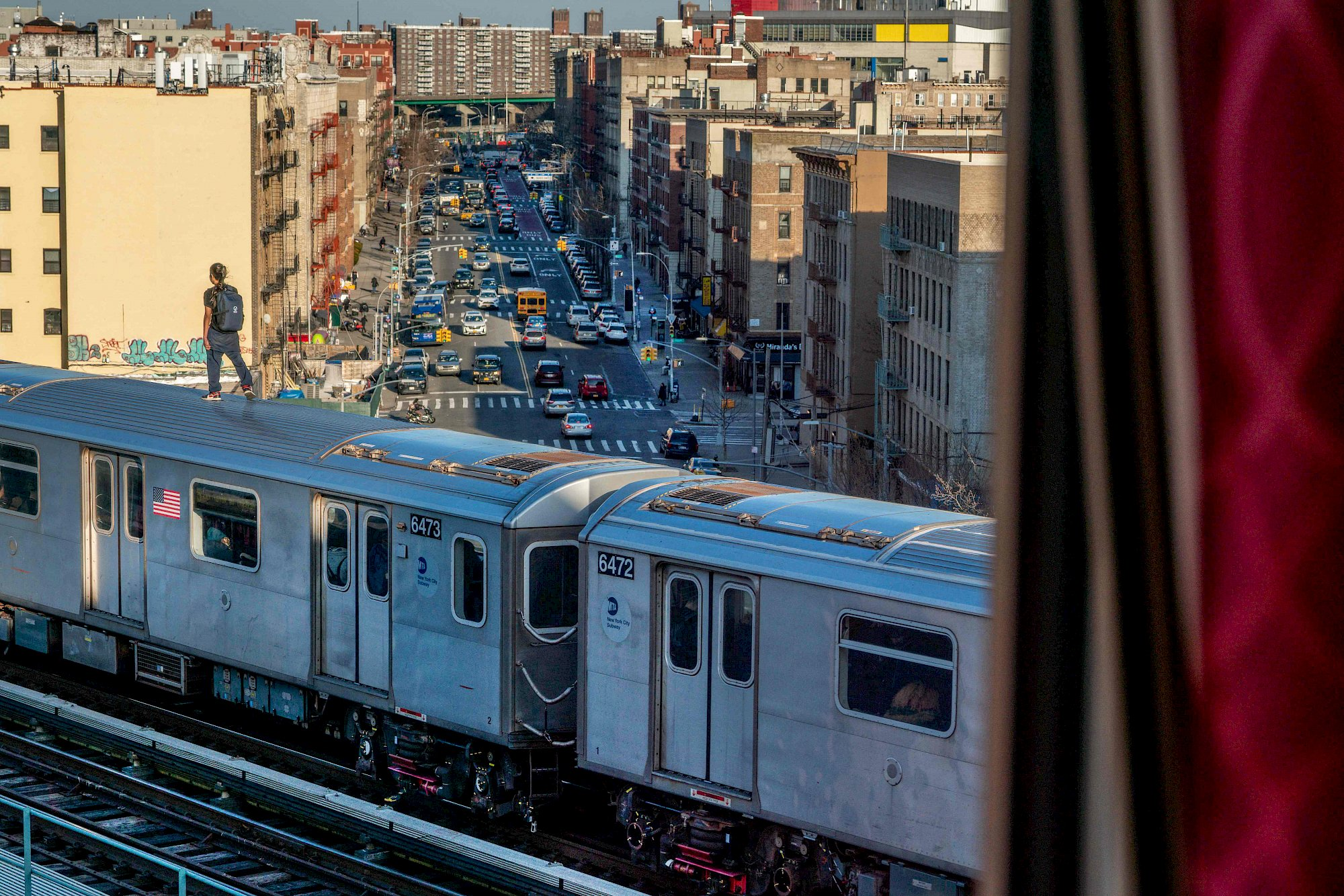 Het zijn bijna altijd jonge mannen, maar dit lijkt wel een vrouw, aan de kaaklijn te zien en het lange haar. Ze staat op een wagon van lijn 5, meldt het bijschrift, maar waar? Op een hoek, aan de rechterkant van de straat, staat met witte letters op een zwart pand: Miranda’s. Erachter is nog net het begin te zien van een D. Het blijkt Miranda’s Dry Cleaners te zijn, een stomerij in E 163rd Street. Vlakbij ligt station Intervale Avenue. De metro is daarvoor aan het remmen. Daarna rijdt-ie nog kilometerslang boven de grond. Tegen de ingang van een tunnel zal ze voorlopig haar hoofd niet stoten.